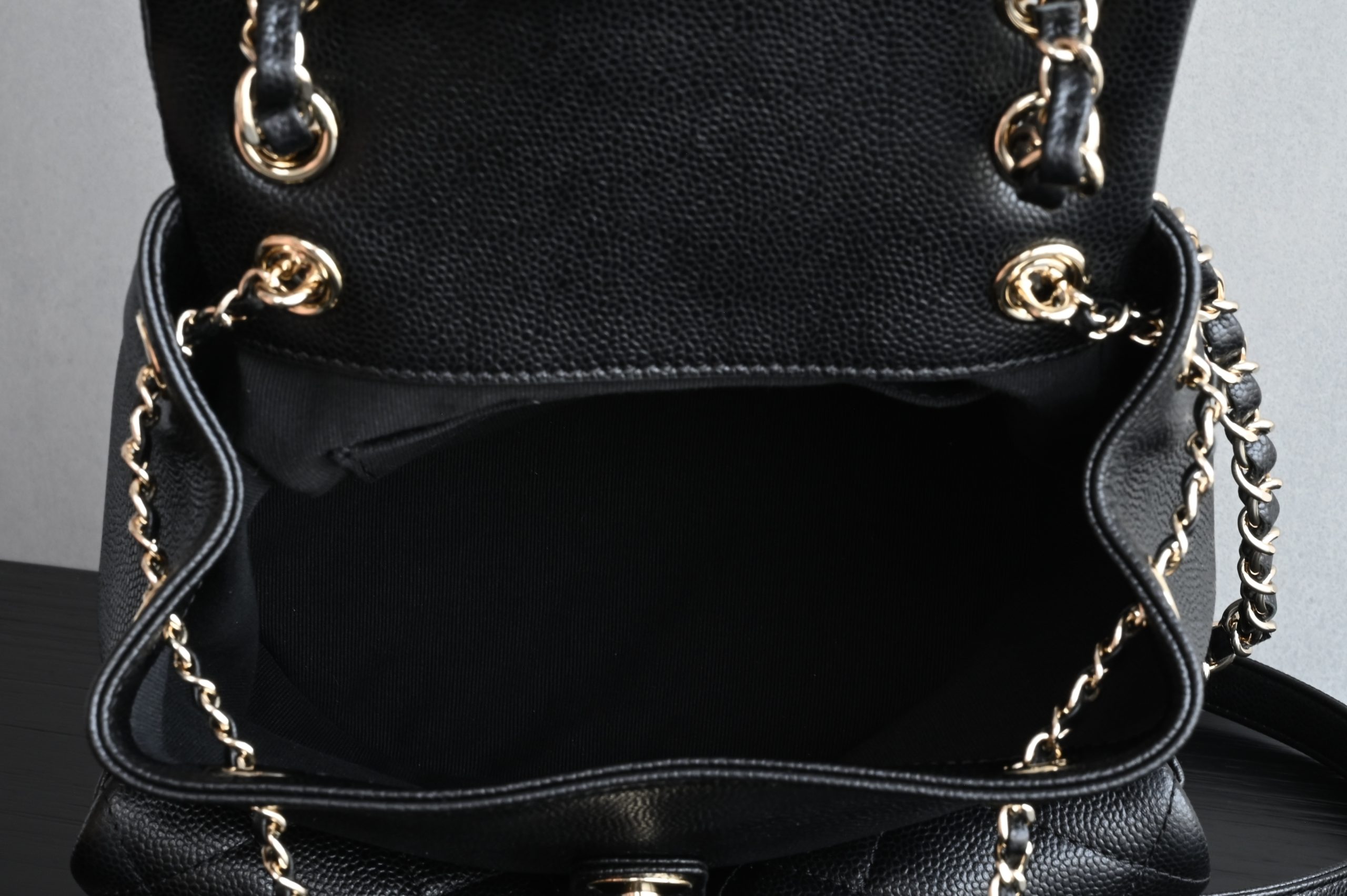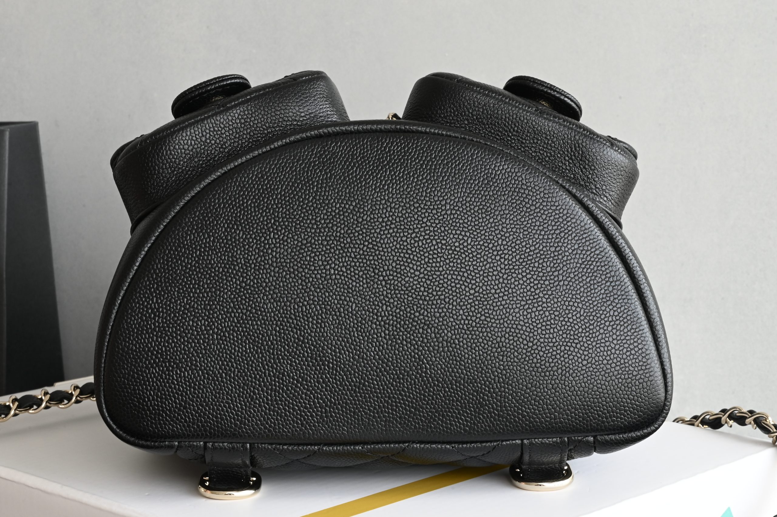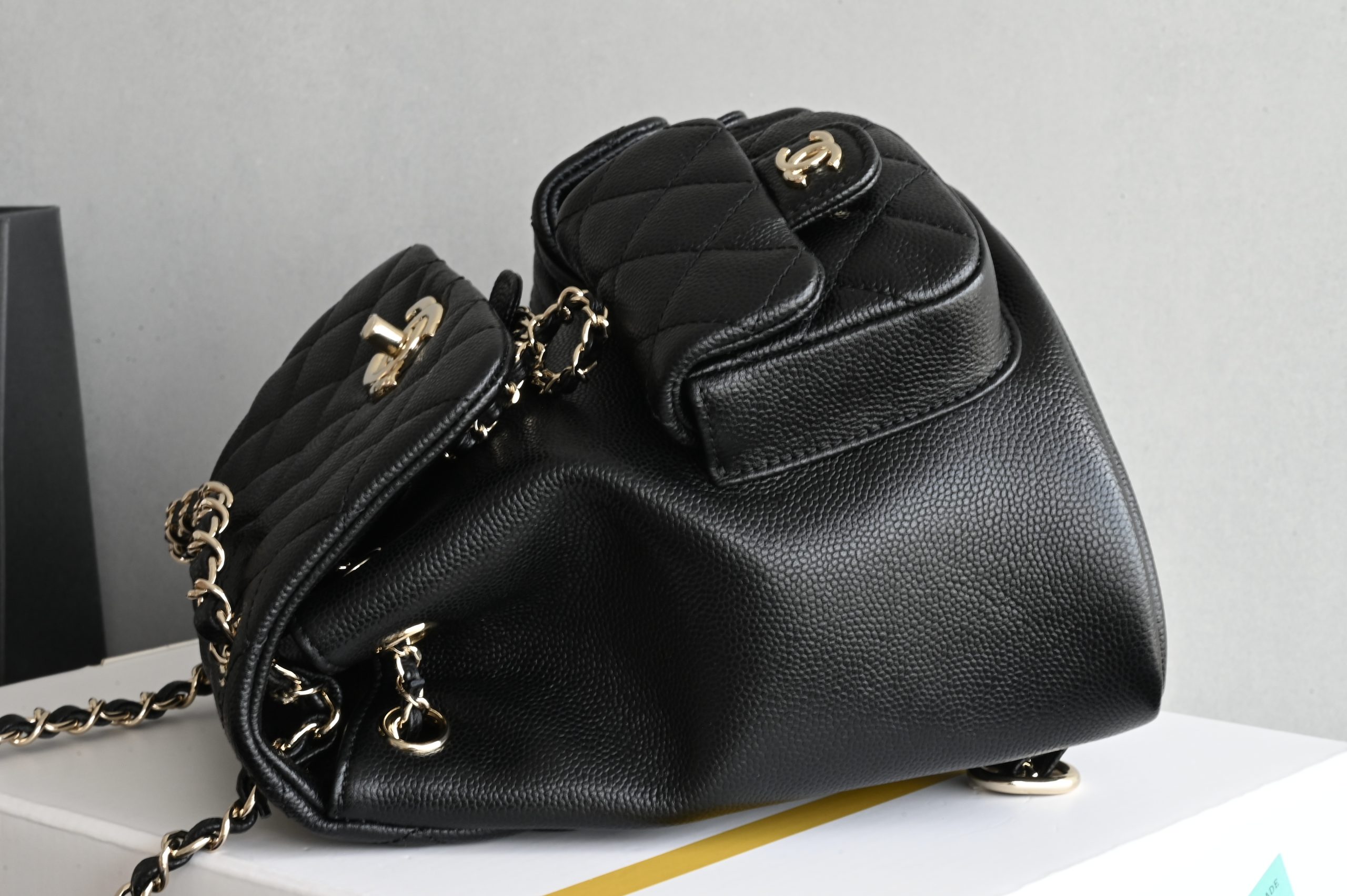 The double-pocket backpack in lychee-patterned calfskin is always the most popular material.