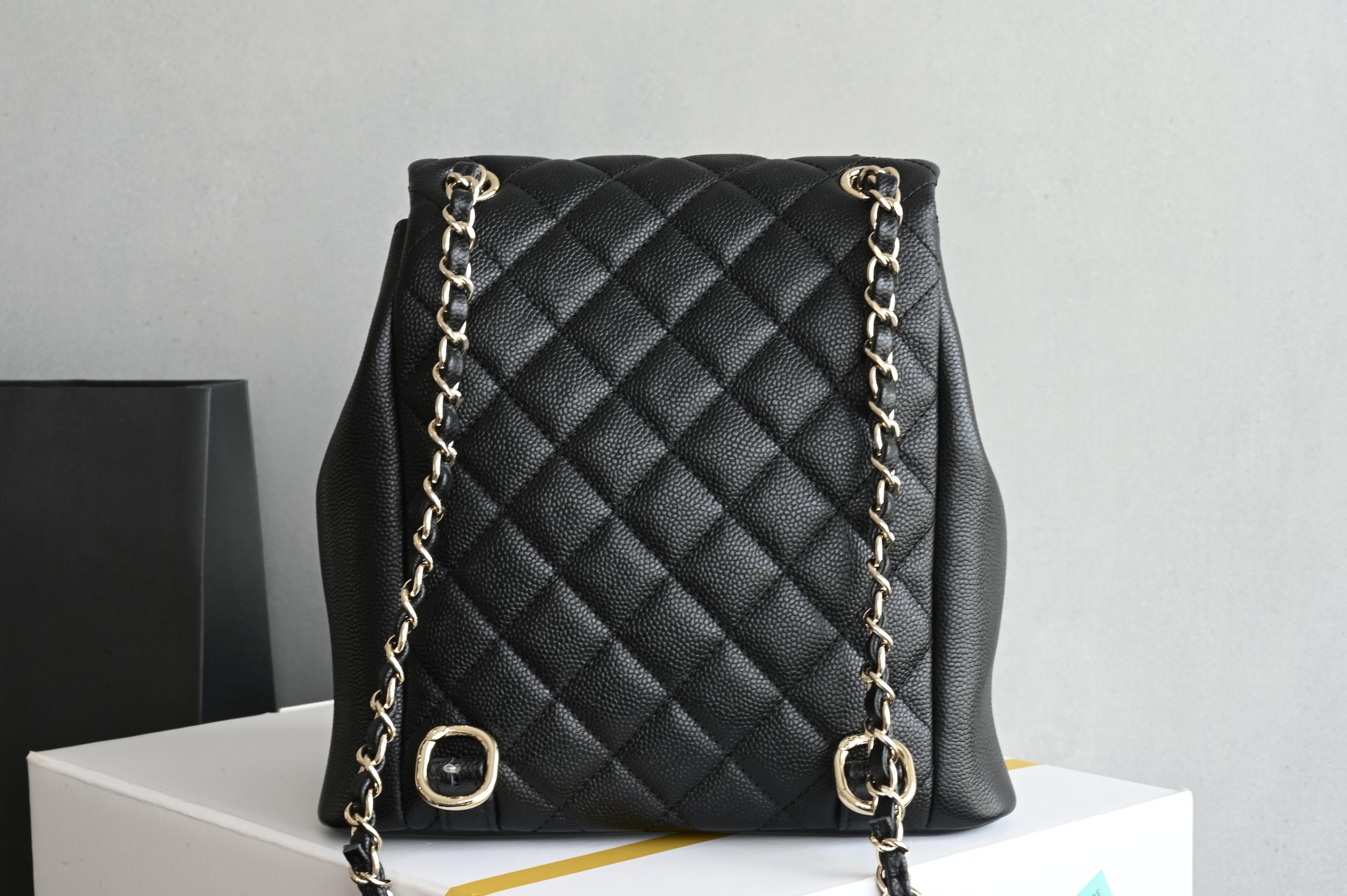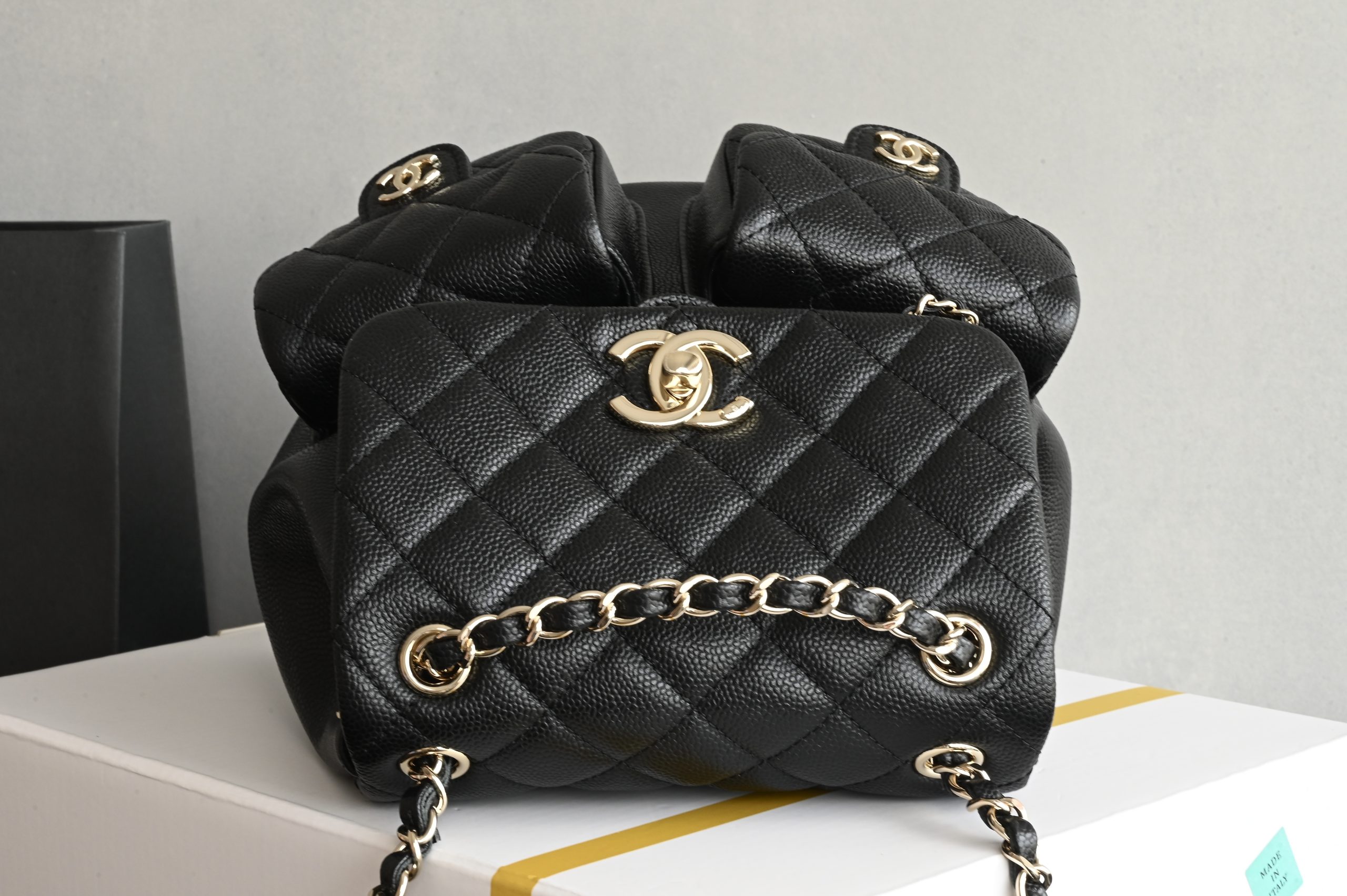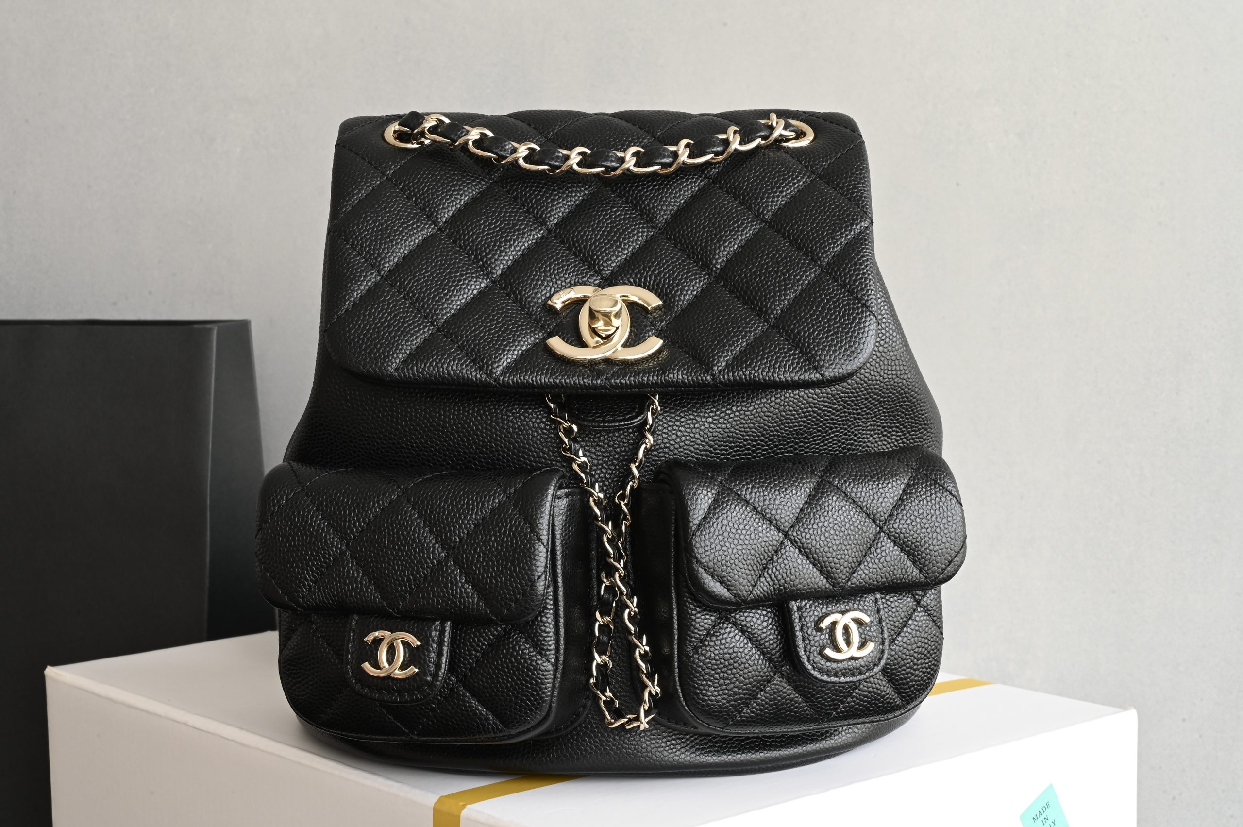 The double-pocket backpack in lychee-patterned calfskin is always the most popular material.