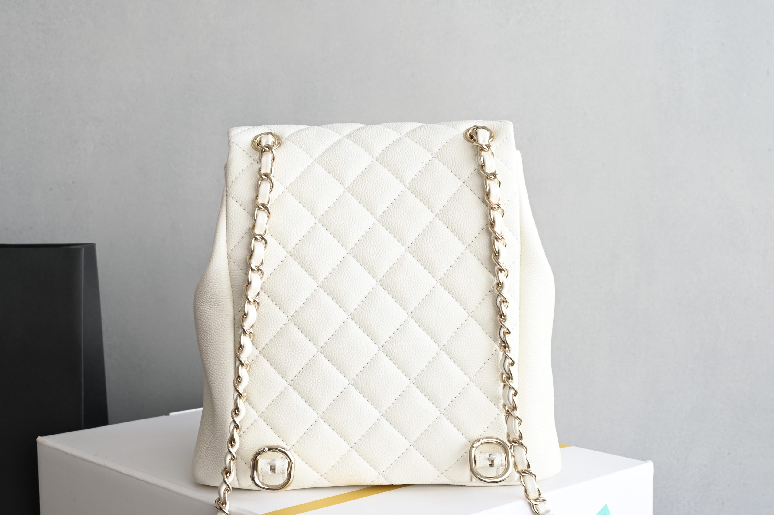 The double-pocket backpack in lychee-patterned calfskin is always the most popular material.