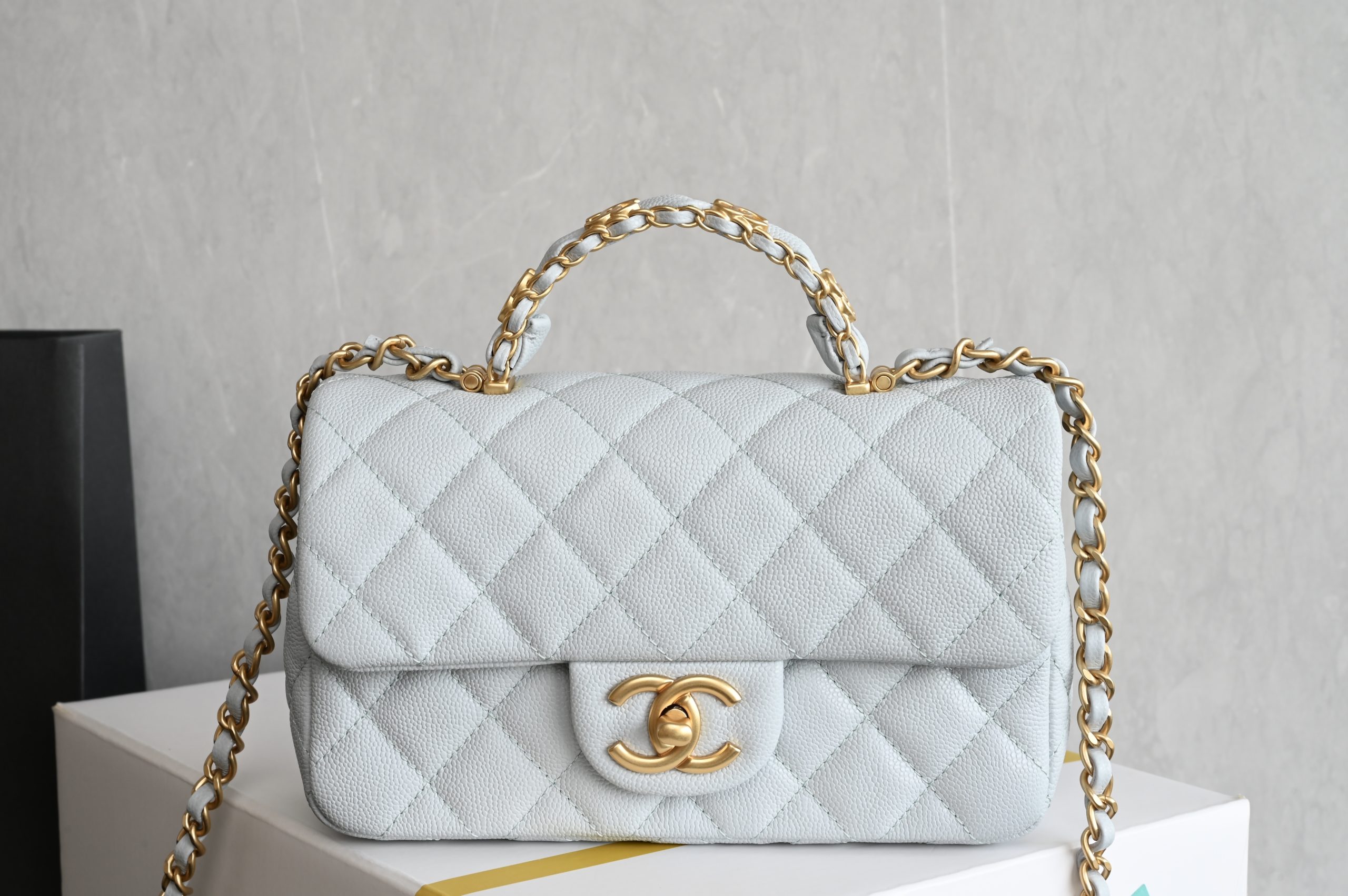 The handle features the classic double C hardware and leather chain.